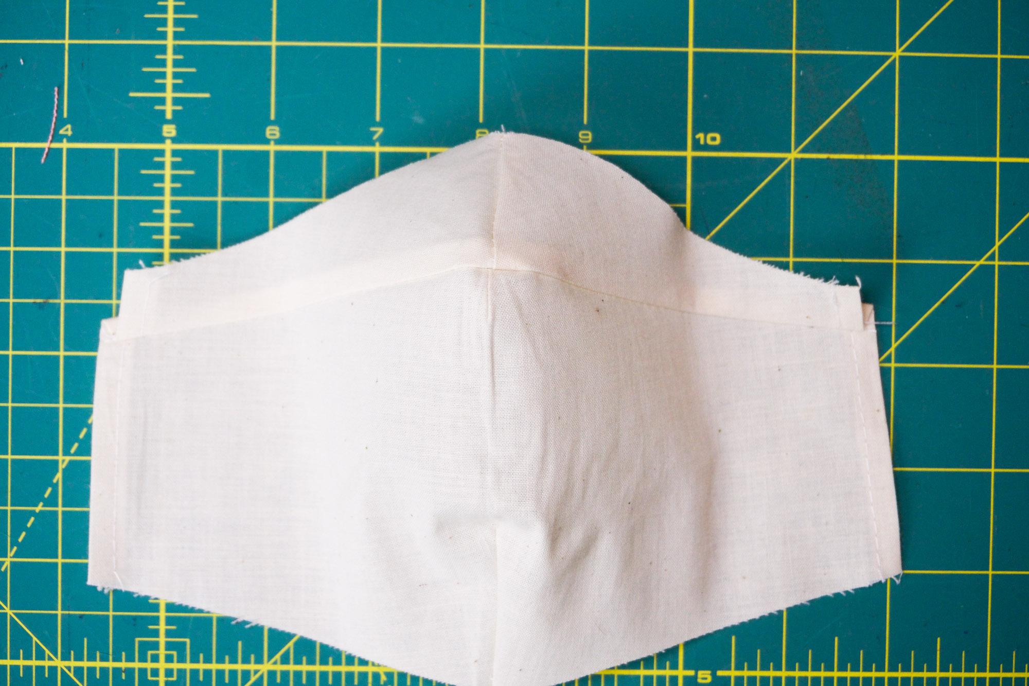 - Clip or pin the mask together right sides together. Sew around the mask with a 1/4” seam . Press the seams well, ensuring to press the excess from the “wings” down in a 1/4” hem.