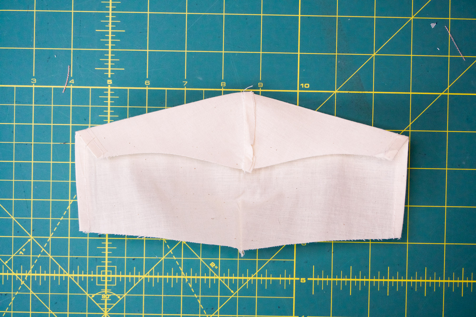 - Sew along folded edge with a 1/4” seam allowance. Then, open up the seam and press top of the dart up. This will form a formed nose bridge.
